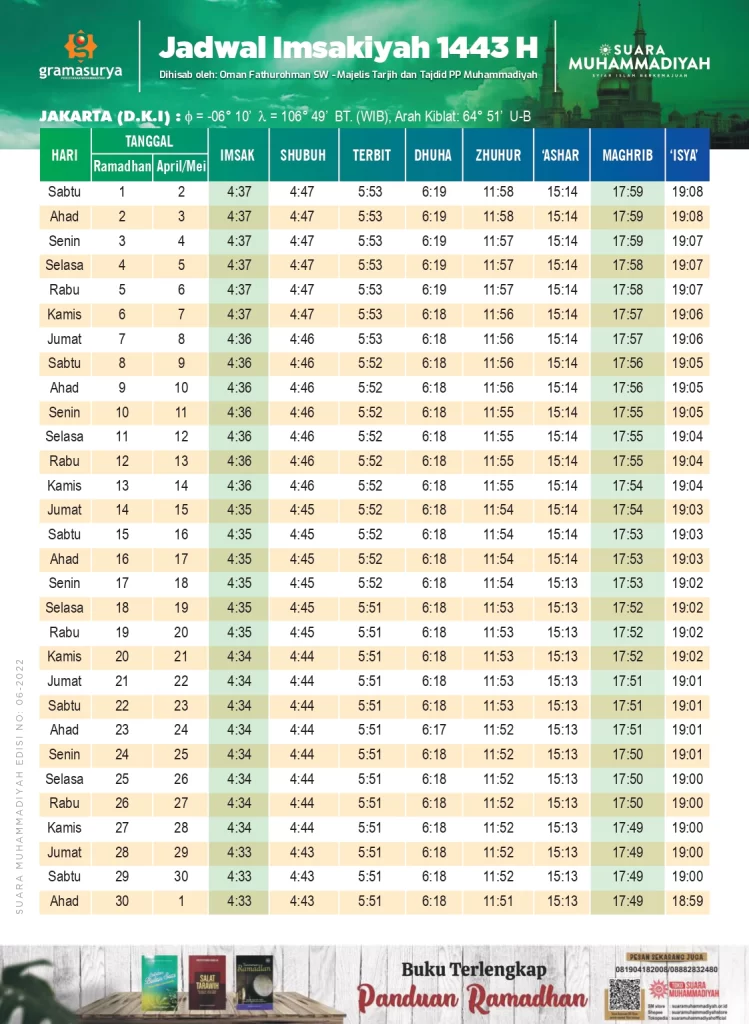 IMSAK0419 SUBUH0429 TERBIT0540 DUHA0607 ZUHUR1150 ASAR1457 MAGRIB1753 ISYA1901. Simak Jadwal Imsakiyah Ramadhan 2022 versi Muhammadiyah. Jadwal Imsakiyah Ramadhan 1443 H di sejumlah kota besar se-Indonesia bisa di download melalui link yang telah disediakan.